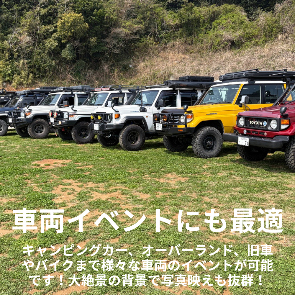 キャンピングカーやオーバーランド、オールドカー、バイクなど車両でのミーティングも可能です。ジャンル問わず敷地内でイベントを開催していただけます!もちろん宿泊も可能なため本イベント~打ち上げまで楽しんでいただけます!