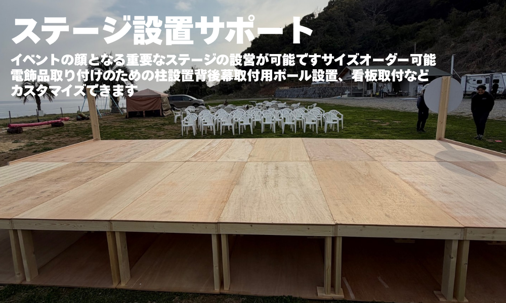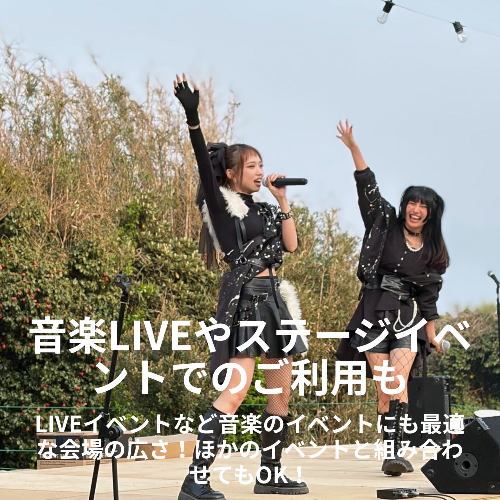 音楽ライブやステージイベントが可能!ステージ設営もお任せください!音響サポートも可能です!また、会場設営飲食スペース設営、日陰タープの設置、演者の控室の設置などもご相談ください。イベント当日のスタッフ派遣も可能です!トイレやシャワーなど多数ございますので大人数の来客にもしっかり対応できます。