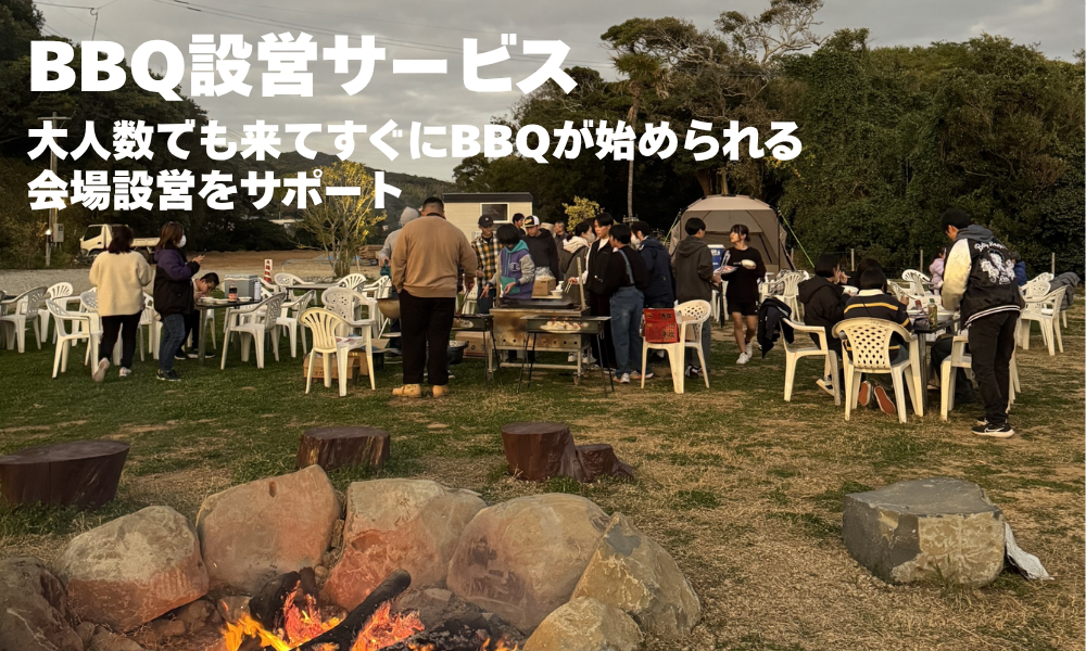 団体でのBBQ会場の設営を行います。日中の場合は日陰の確保のためタープ設営も行います。また、BBQサポートスタッフ派遣や音響設備の設置も可能です!