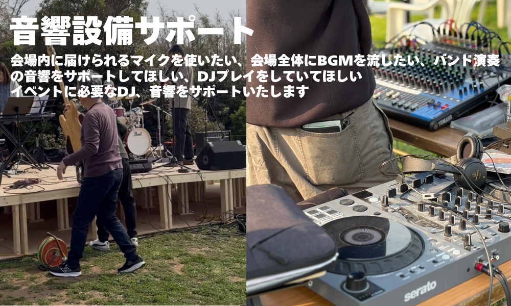 イベントに必要不可欠なBGMや楽器周りの音響設備をサポートいたします。マイクを使いたい、DJによる本格演奏を使いたいなどご要望をいただければ手配が可能です。イベント日程確定前にご相談ください。