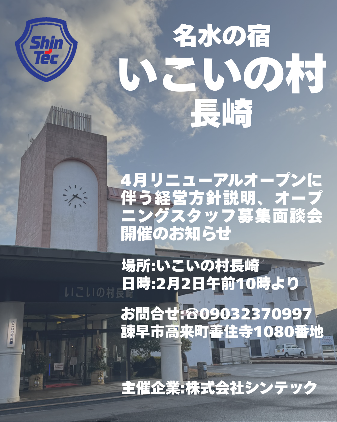 こんにちは!この度2026年4月1日より長崎県諫早市いこいの村長崎の運営を同じく諫早市に本社を構える株式会社シンテックが行うことが決定しています。それに伴い、株式会社シンテックによる今後の経営方針説明会、リニューアルオープンスタッフの募集面談会を2月2日10時いこいの村長崎にて執り行うことが決定しましたのでご報告いたします。